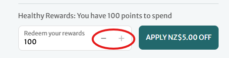 - Use the Healthy rewards selector at checkout to choose how many rewards you would like to use towards your order, to select amount click on the + -